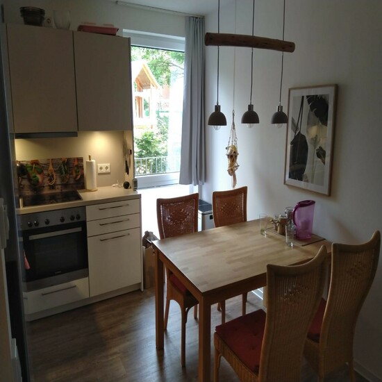 Die Wohnung ist mit einer hochwertigen Einbauküche ausgestattet; enthalten ist ein Herd mit Ceranfeld, Geschirrspüler sowie eine Kühl- und Gefrierkombination. Die Einbauküche ist großzügig in den Wohnbereich integriert.